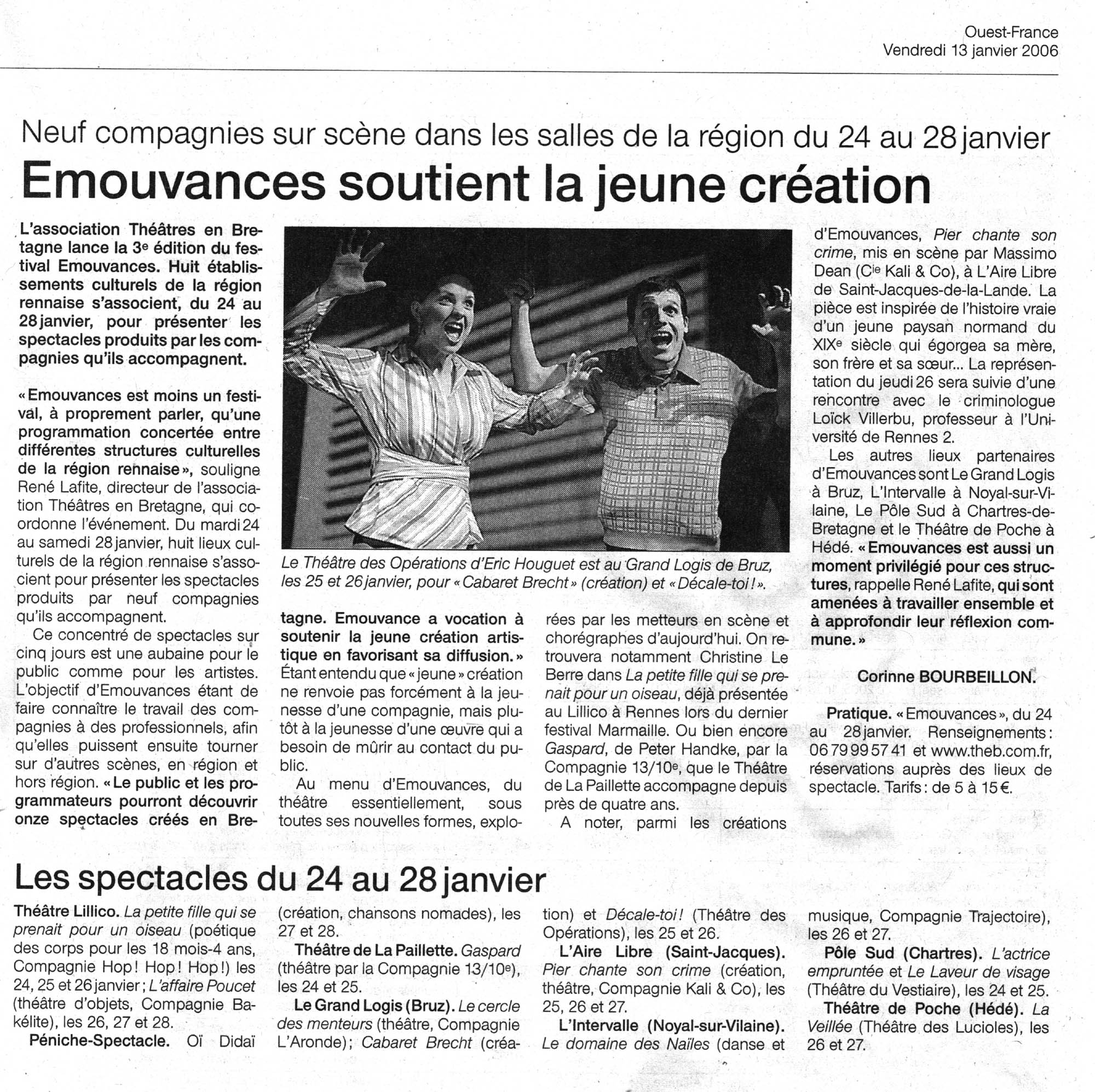 Le texte en lui-même, est né de trois processus différents. La première partie, un enterrement, a été mis en écriture juste avant les premières séances de travail, et raconte la mise en terre d’un homme dans le regard de sa petite fille. Cette forme, à la fois proche de la nouvelle, ou une manière détournée de faire conte, est le fruit d’une discussion entre l’auteur, le metteur en scène et la comédienne. La seconde partie est antérieure au projet, et appartient à un recueil de texte qui se nomme « À corps perdu / les colporteurs ». Ce texte a été retravaillé lors des séances en décembre 2003 à Brest, pour non pas l’adapter mais le clarifier. La forme de ce texte est plus poétique – à l’intérieur, où se projettent les questions de cette petite fille, de cette femme, après, ou longtemps après l’enterrement. La troisième partie s’est écrite avec le plateau, avec l’espace et les questions qu’il pose, avec les corps des uns et des autres. En cela il est a priori plus théâtral, tourné vers le dialogue, même impossible. Il offre peut-être aussi une chance au burlesque de venir déformer la violence qui s’installe.
